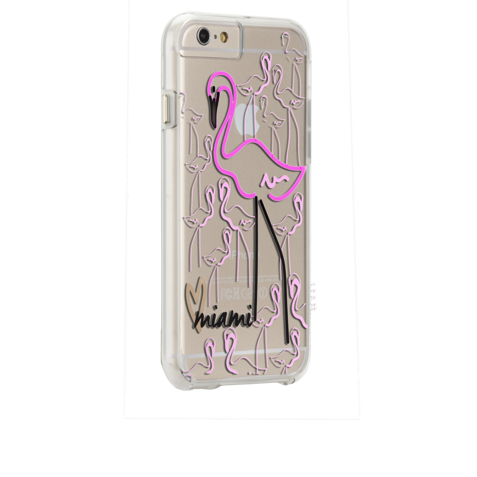 “Flirty fun flamingos show your love for Miami with this limited edition metallic print for iPhone 6. Designed to offer a minimalist profile with a smooth transparent finish, this dual-layered case also protects against everyday drops and dings. Color-coordinating gold buttons complete the look.”