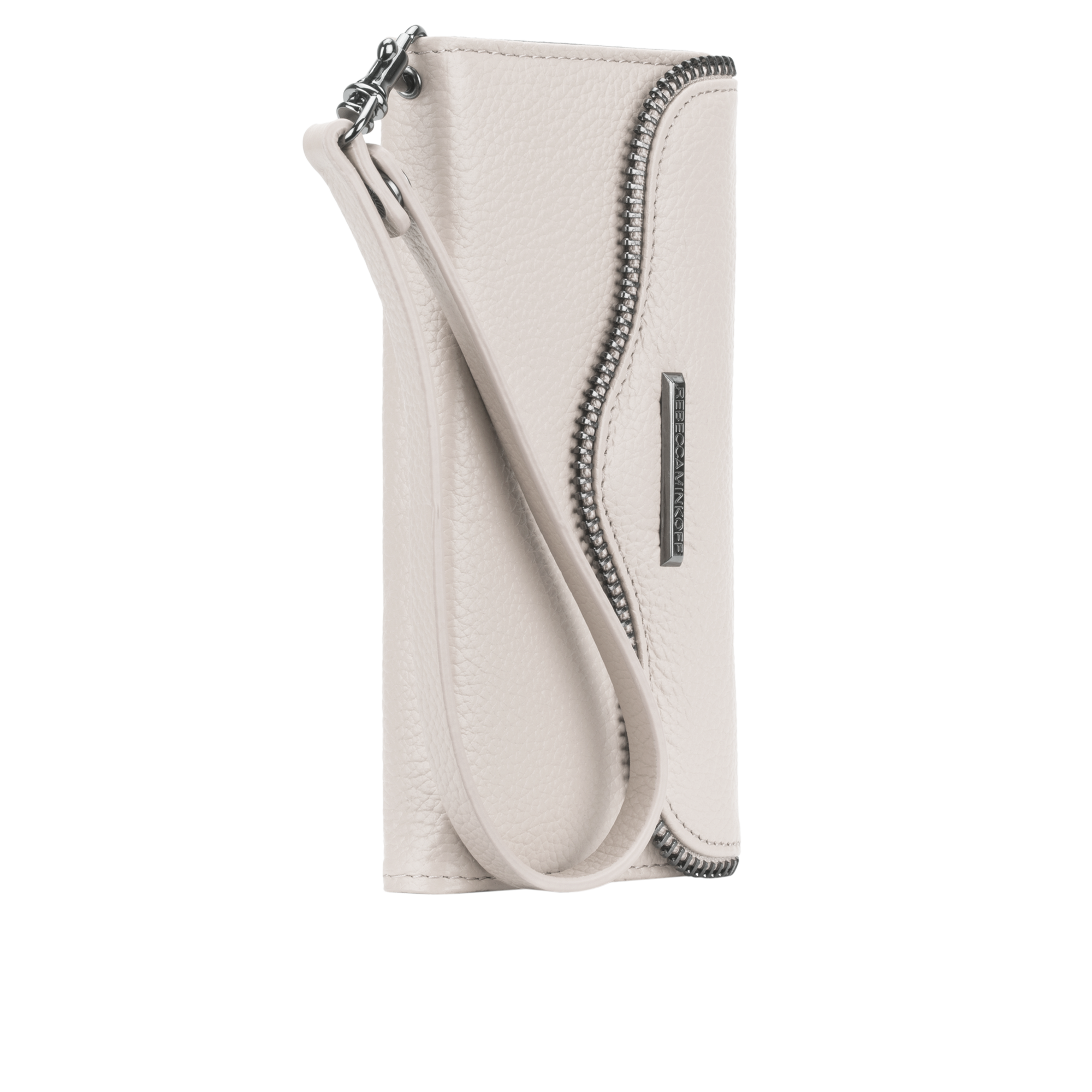 “This chic genuine leather wristlet carries your daily essentials all in one place, and features Rebecca’s signature M.A.B. flap design and zipper detailing. Ideal for when you don’t feel like carrying a handbag, this chic folio does it all.”